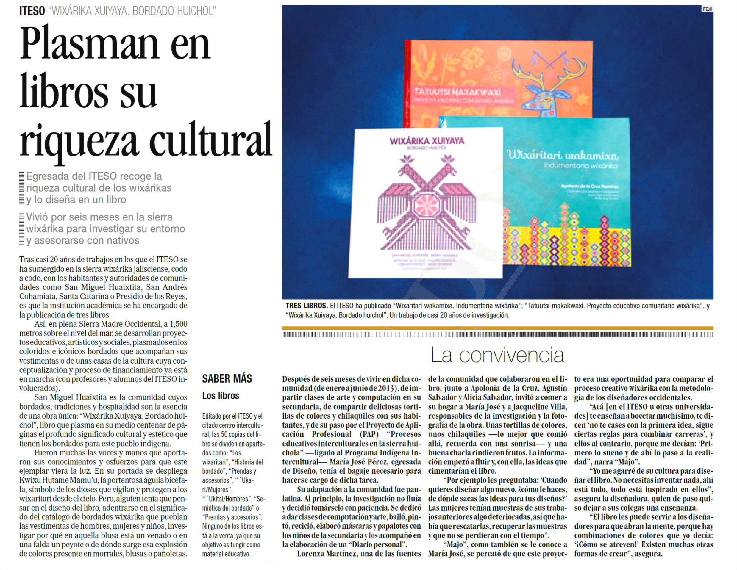 Tras casi 20 años de trabajos en los que el ITESO se ha sumergido en la sierra wixárika jalisciense, codo a codo, con los habitantes y autoridades de comunidades como San Miguel Huaixtita, San Andrés Cohamiata, Santa Catarina o Presidio de los Reyes, es que la institución académica se ha encargado de la publicación de tres libros. ( El Informador http://goo.gl/rXOKx9 )