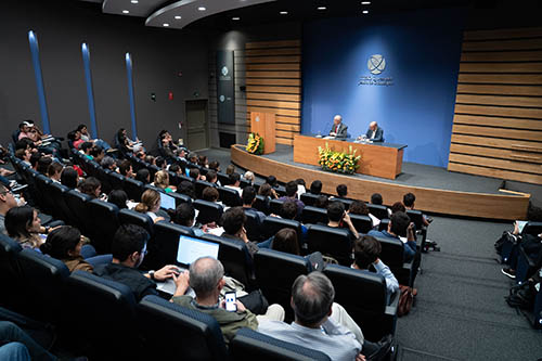 El jesuita expuso ante estudiantes y profesores de la universidad las circunstancias que llevaron a Venezuela de la promesa de cambio de Hugo Chávez a la crisis actual que ha provocado que su población sufra las consecuencias de una hiperinflación y cuatro millones de personas abandonen el país sudamericano. Destacó que durante más de 50 años, Venezuela tuvo un crecimiento económico sostenido y sin inflación.